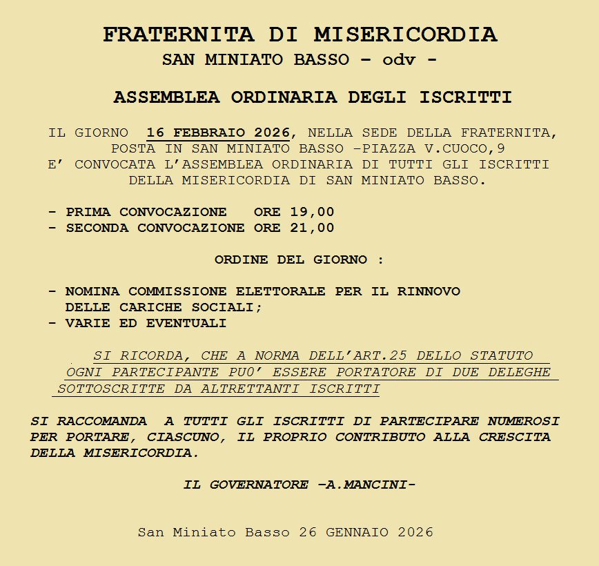 IL GIORNO 16 FEBBRAIO 2026, NELLA SEDE DELLA FRATERNITA, POSTA IN SAN MINIATO BASSO -PIAZZA V.CUOCO,9 - E’ CONVOCATA L’ASSEMBLEA ORDINARIA DI TUTTI GLI ISCRITTI DELLA MISERICORDIA DI SAN MINIATO BASSO.
